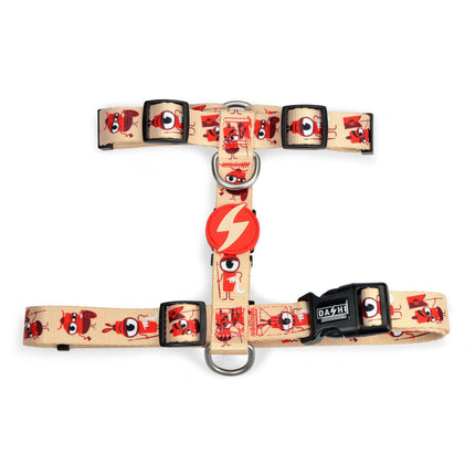 Dashi Tribes Back Harness guarantees a stylish look and safety. These colorful guard harnesses for dogs, featuring a fun pattern of warrior creatures from the Dashi tribe, are made from strong, tightly woven polyester webbing, making them extremely durable. They can withstand even vigorous pulls and changing weather conditions. This model has separate adjustments for the front and back harness, as well as for the chest, ensuring a perfect fit for your pet's body shape. They do not cause discomfort and do not restrict the dog's movements. This is an ideal solution for breeds with atypical body structures. The harness features a four-point buckle that can withstand heavy loads. With the use of two D-rings on the back section, there is the option to attach the leash at the front or back of the harness, depending on individual needs. Attaching close to the neck provides greater control over your companion. The Dashi harness will bring incredible joy to both you and your pet during walks. The Tribes model is characterized by modern and fanciful design. The designer print will delight with its originality and put many dog owners in a positive mood. Moreover, before hitting the market, all Dashi products undergo strict quality and safety controls. Provide your pet with comfort, safety, and style with Dashi.