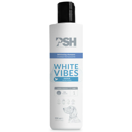 Dog Shampoo, PSH White Vibes, from the Daily Beauty line, designed for home use. This product is formulated for the care of dogs with white and light-colored coats. The shampoo not only cleans your pet's fur from dirt but also enhances its appearance. It contains kaolin, aloe, and hydrolyzed wheat proteins. Kaolin, also known as white clay, is recognized for its brightening and illuminating properties for fur color. It is rich in nutrients. It cleanses and detoxifies, has anti-inflammatory effects, regulates sebum production, and prevents dandruff. It gently exfoliates dead skin, adding volume to the hair. Aloe extract has strong moisturizing and protective properties. Wheat proteins rebuild and strengthen the hair. Glycerin has softening and smoothing abilities, preventing moisture loss. The shampoo leaves a pleasant, refreshing, fruity scent. The hypoallergenic fragrance and the absence of parabens, silicones, and kathon (an irritating preservative blend) make PSH Whitening Vibes shampoo an ideal choice for sensitive pets, suitable for frequent use. Its environmentally friendly, vegan formula, based on green chemistry principles, is a great choice for those who care about the well-being of our planet. The production process is based on the principle of avoiding pollution, using easily renewable raw materials, and promoting reactions occurring at room temperature to reduce energy consumption.