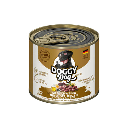 Doggy Dog mitrā barība tiek ražota Vācijā ar sulīgiem, gaļīgiem gabaliņiem, papildinātiem ar vērtīgiem piedevām, piemēram, kartupeļiem, spinātiem, buljonu, laša eļļu, zaļo lūpu gliemenēm un olu. Maltīte ir viegli sagremojama un labi uzsūcas, pilnībā bez graudiem un glutēna. Tajā nav krāsvielu, aromatizētāju vai ĢMO. Nav pievienots cukurs vai mākslīgie konservanti. Tā nav testēta uz dzīvniekiem.