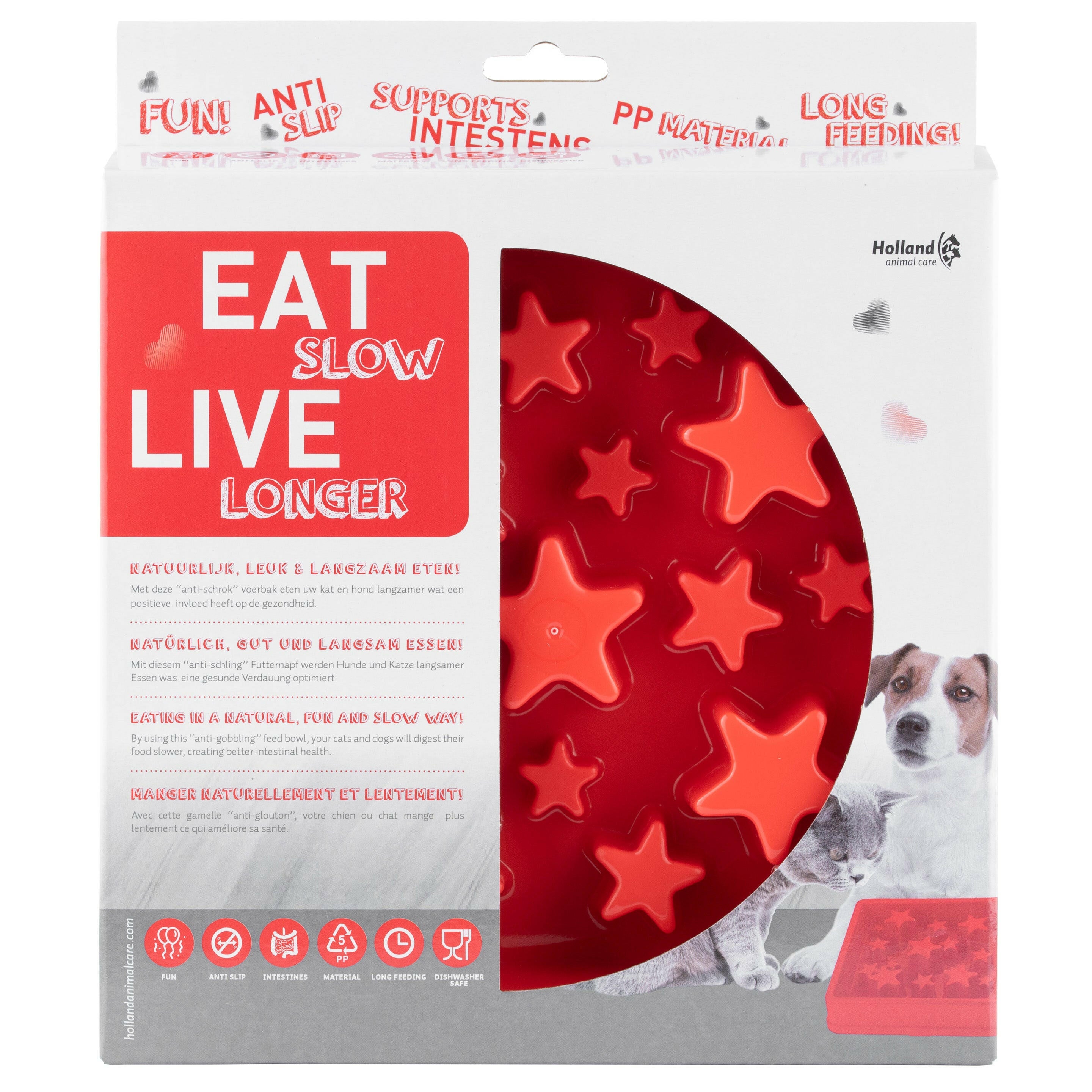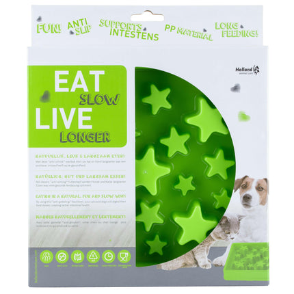 Ēd Lēnāk Dzīvo Ilgāk Zvaigzne ir suņu bļoda, kas palēnina barības un kārumu ēšanu, pateicoties paceltajām zvaigžņu formām iekšpusē. Ja jūsu mājdzīvnieks pārvēršas par putekļsūcēju, ieraugot ēdienu, un cieš no gremošanas traucējumiem, vemšanas un vēdera uzpūšanās pēc ātras maltītes, Zvaigznes bļoda būs ideāls risinājums viņiem. Šīs bļodas ir atbilstoši nosauktas Ēd Lēnāk Dzīvo Ilgāk! Ātra ēšana var izraisīt kuņģa torsiju, kas, ja netiek ārstēta (un prasa tūlītēju ķirurģisku iejaukšanos), var būt letāla. Kuņģa torsijas simptomi ietver pārmērīgu siekalošanos, vēdera pietūkumu, nepatiesu vemšanu un elpošanas grūtības. Kvadrātveida bļoda ar zvaigžņu labirintu iekšpusē ievērojami palēnina maltītes patēriņu. Tas, savukārt, ierobežo norīta gaisa daudzumu, novērš vēdera uzpūšanos un samazina kuņģa torsijas risku. Jūsu suns būs veselīgāks, slaidāks un mierīgāks, izmantojot šo bļodu. Pārāk svarīgiem suņiem lēnāka maltītes patēriņš palīdz sasniegt sāta sajūtu pēc mazākas porcijas, padarot vieglāku liekā svara zaudēšanu. Papildu ieguvums, barojot šajā bļodā, ir nomierinošais efekts: koncentrēšanās uz kārumu izņemšanu un laizīšanu ir nomierinoša ietekme uz jūsu suni, padarot parastu maltīti par aizraujošu aktivitāti.