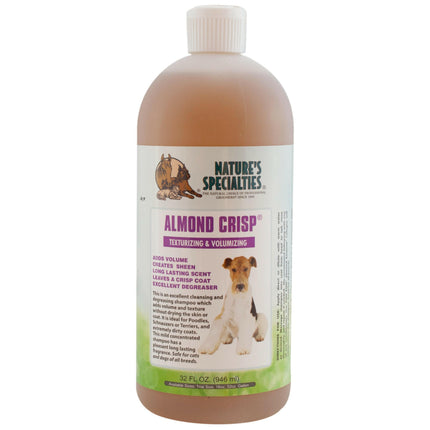 Profesionāls suņu un kaķu šampūns Nature's Specialties Almond Crisp Shampoo. Speciāli izstrādāts mājdzīvnieku kopšanai, kuru kažoks prasa rūpīgu tīrīšanu un attaukošanu, kā arī piešķir atbilstošu tekstūru un apjomu. Piemērots galvenokārt terjeriem, šnauceriem, pointeriem un pūdeļiem. Var izmantot jebkura cita veida kažokam. Maigā, sulfātus nesaturošā tīrīšanas bāze attīra kažoku, netraucējot dabisko ādas un matu aizsargslāni. Alveja un pantenols nomierina un paātrina bojātas ādas reģenerāciju, aizsargājot to no nelabvēlīgiem ārējiem faktoriem, piemēram, karsta gaisa un vides piesārņotājiem. Nodrošina optimālu ādas un kažoka mitrināšanu. Garšaugu pievienošana nodrošina spēcīgu vitamīnu un minerālvielu devu, kas baro mājdzīvnieka ādu un kažoku. Šampūns atjauno kažoka dabisko spīdumu, piešķir tam pareizu tekstūru un apjomu, un padara matus viegli veidojamus. Atstāj ilgstošu saldo mandeļu aromātu. Drošs visām šķirnēm, suņiem un kaķiem, kaķēniem, kucēniem un maziem mājdzīvniekiem. Koncentrāts 1:32.